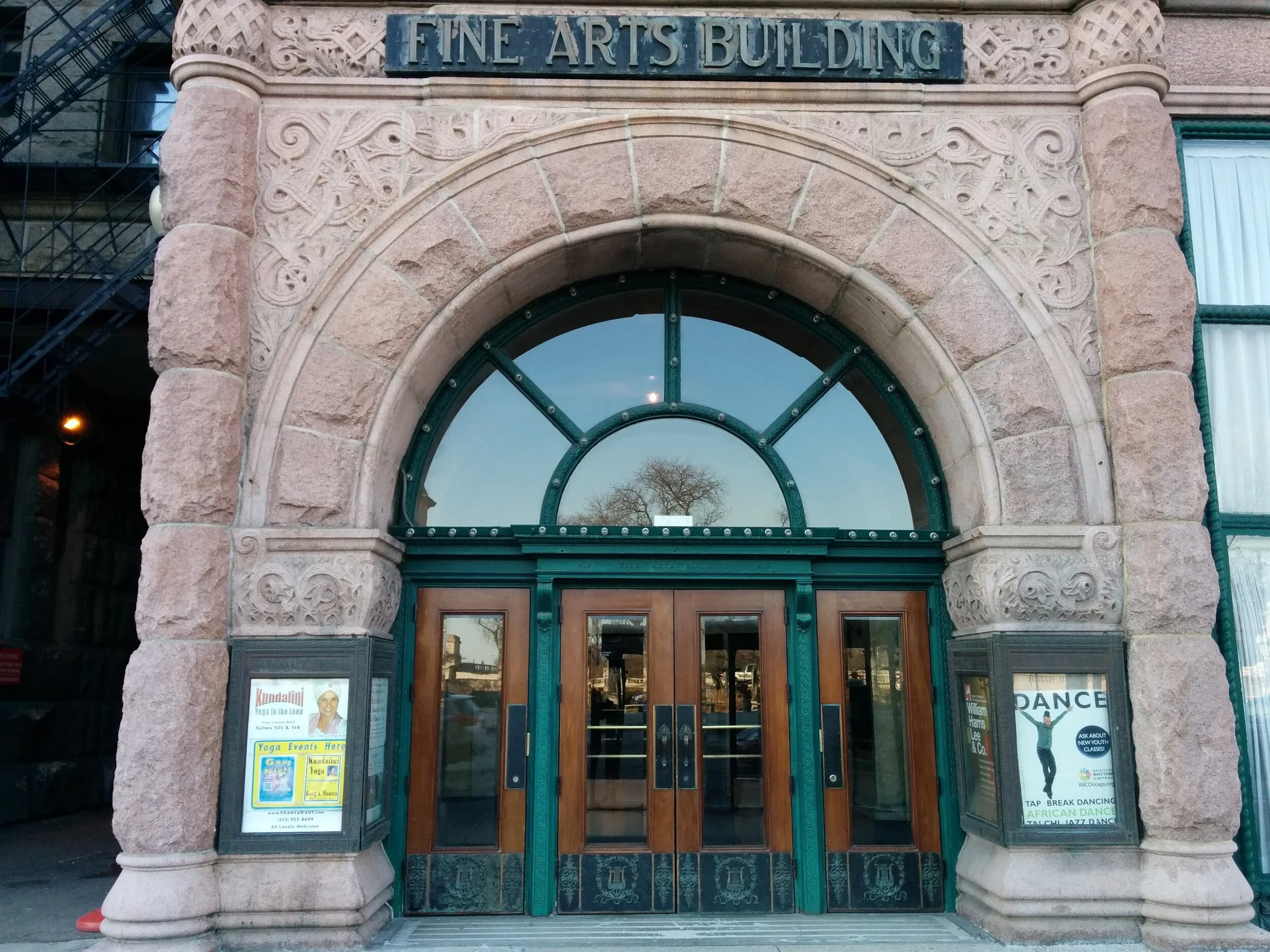 The Fine Arts Building was built between 1885 and 1887 as the “Studebaker Brothers Lake Front Carriage Repository,” a Midwestern headquarters for the company that would eventually build cars, but which at the time produced 75,000 carriages annually. Its first “horseless carriage” was electric, and introduced in 1902; in 1904 it launched gasoline-powered engines. The giant plate glass windows in the base of the Fine Arts Building were intended to maximize window-shopping potential for wealthy passers-by. Imagine the likes of “Gone with the Wind” carriages displayed in those windows! Indeed, to this day, there remains an overlooked nod to the building’s original purpose: you can actually see “STUDEBAKER” carved into the pink granite in the middle of the building, just above ground level.